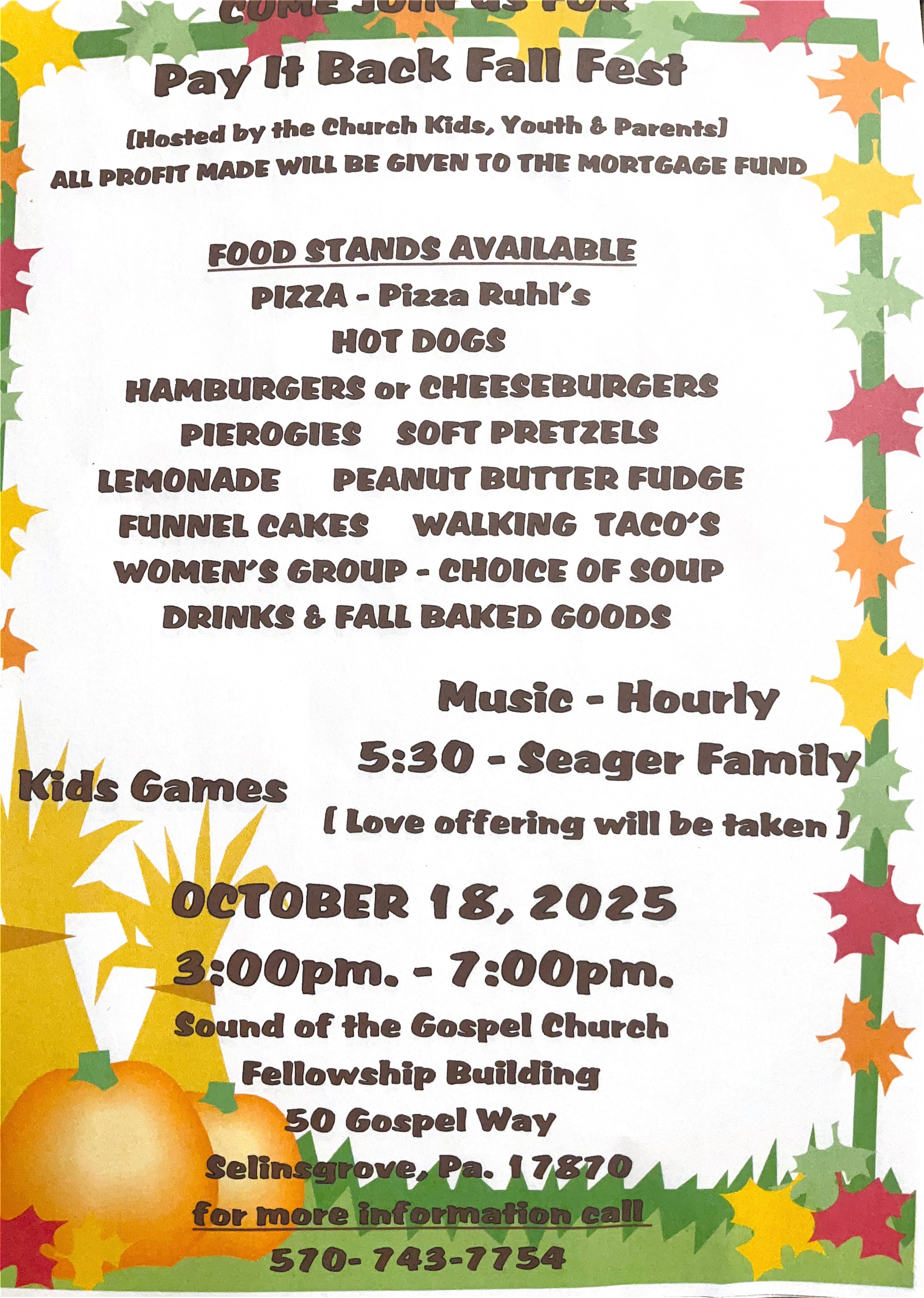 Fall Fest at Sound of the Gospel Church with food, fun, and Gospel singing on Saturday, October 18th from 3:00-7:00. The Seagers will be singing at 5:30. 80 Gospel Way Selinsgrove, PA 17870.