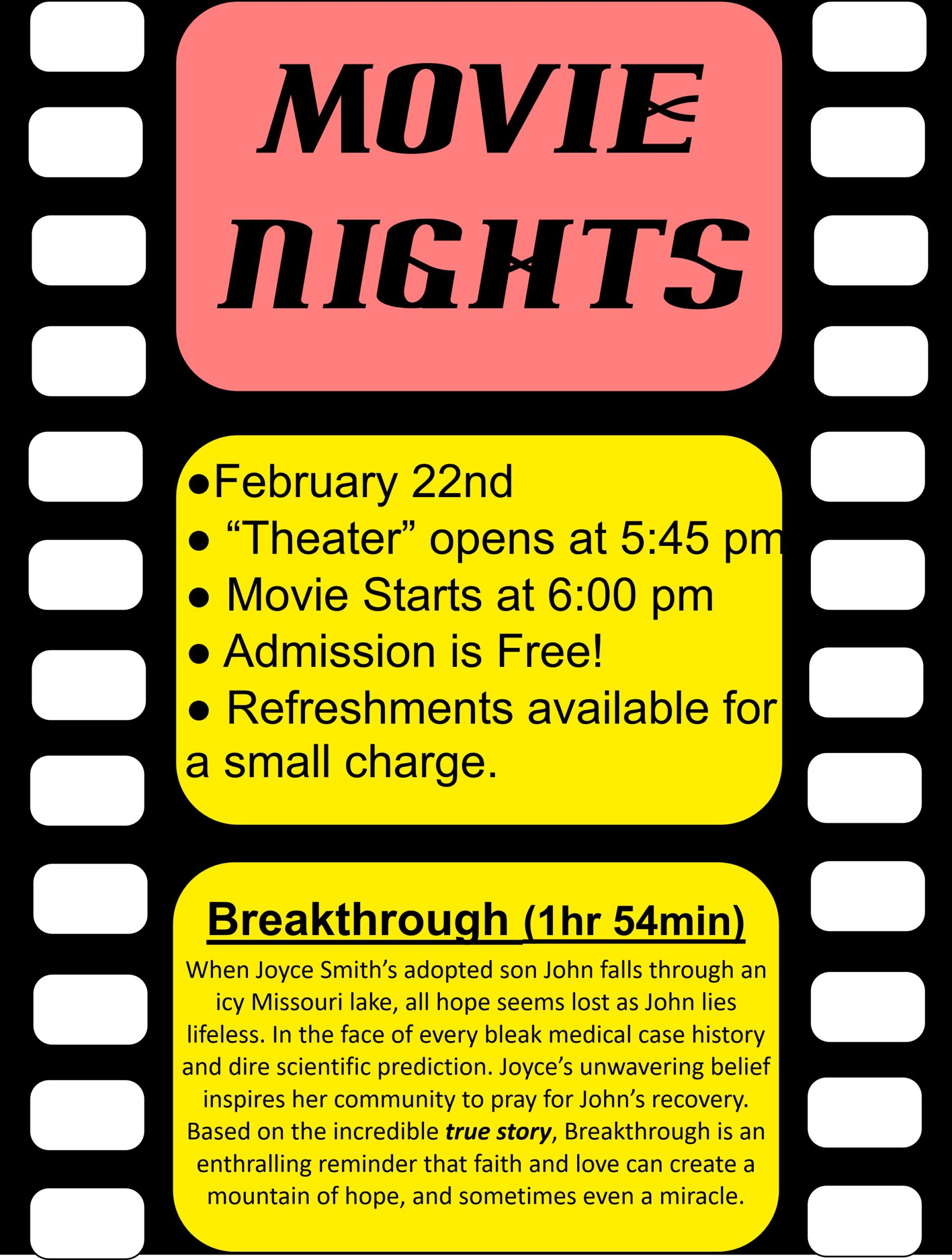 22feb5:45 pm8:00 pmMovie Night5:45 pm - 8:00 pm Event Organized By: Melinda Guyer