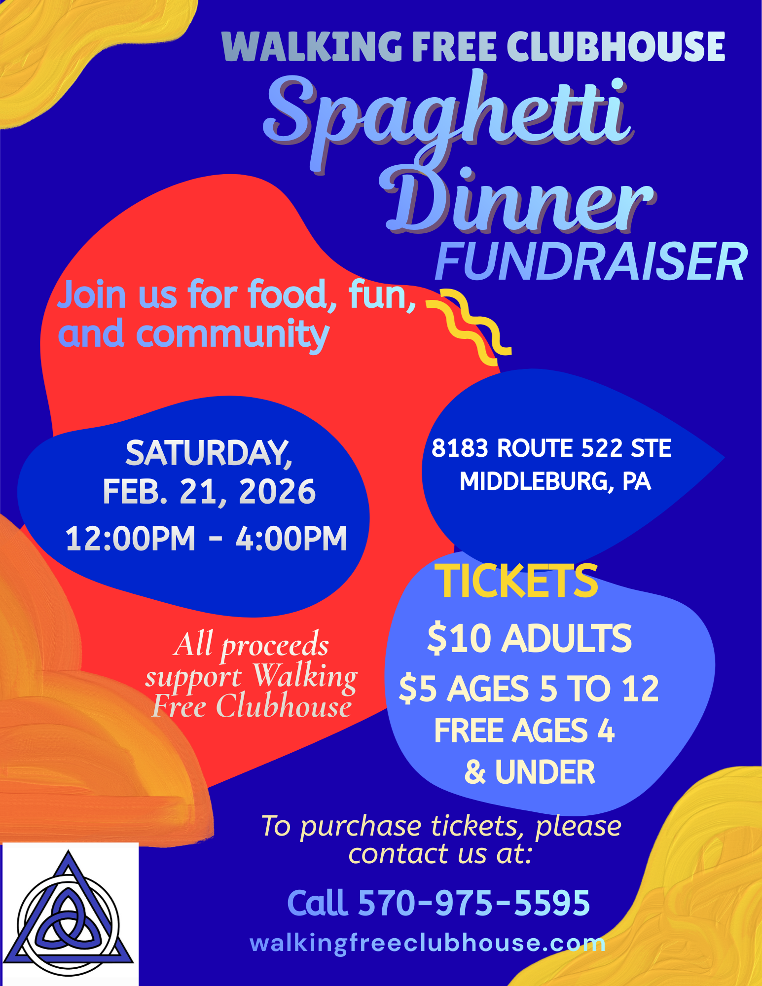 Walking Free Clubhouse is hosting a Spaghetti Dinner Fundraiser to help keep our doors open and providing services. On the menu is Spaghetti, sauce, meatballs, salad, rolls, deserts, and beverages.