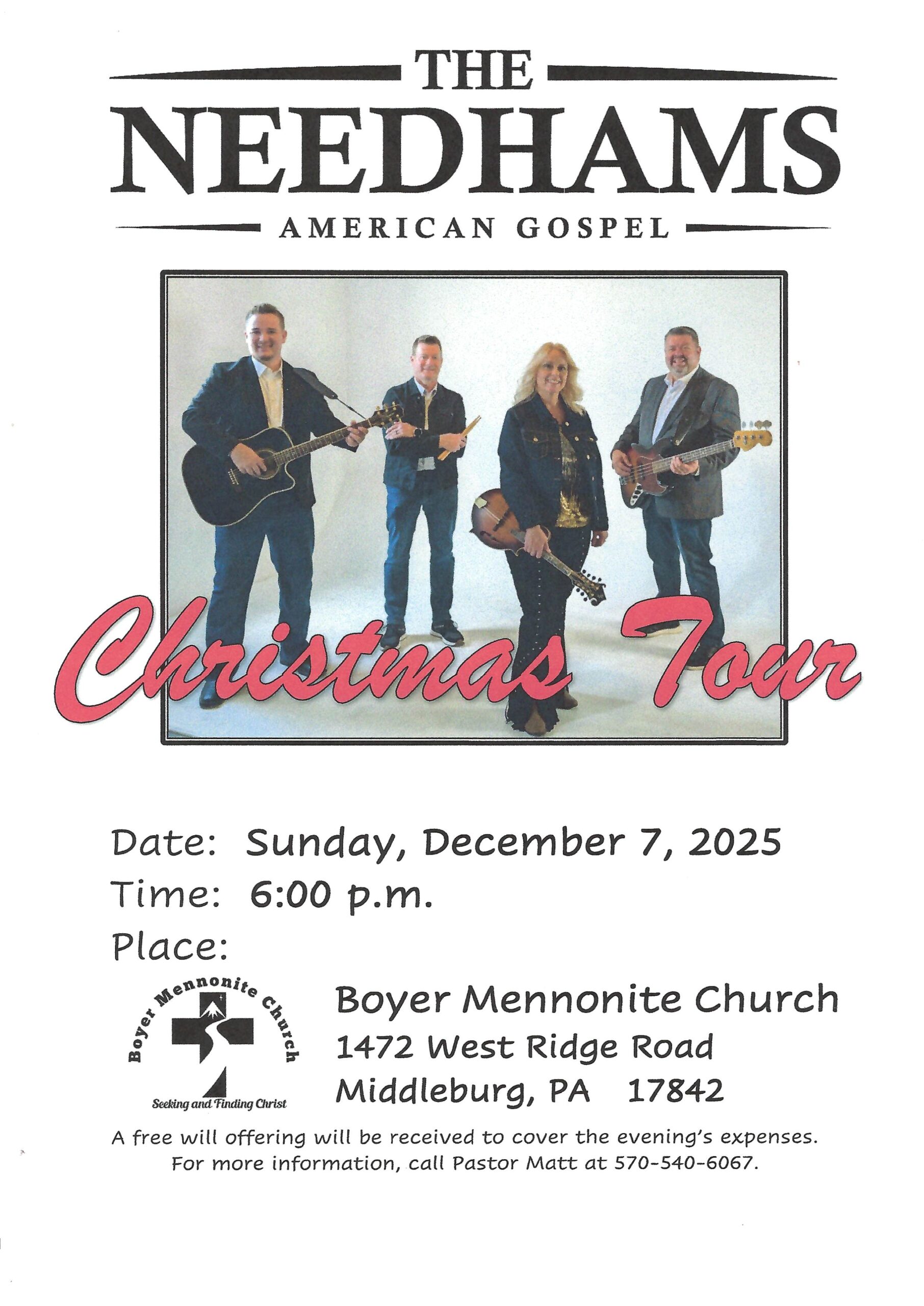 The Needhams, an American Gospel singing group, will be performing their Christmas concert at Boyer Mennonite Church, 1472 West Ridge Road, Middleburg, on December 7 at 6:00 p.m. A free will offering