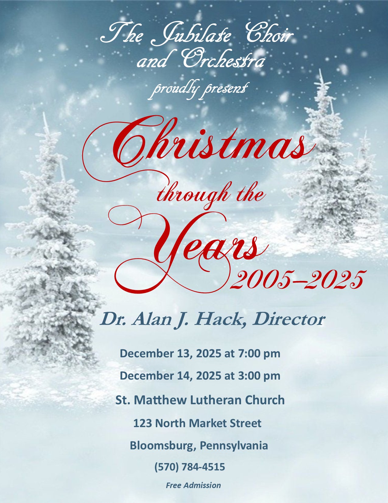 The Jubilate Choir and Orchestra will present its 20th Anniversary Christmas Concert, “Christmas Through the Years,” on Friday, December 13 at 7:00 PM and Saturday, December 14 at 3:00 PM at St. Matthew Lutheran Church in Bloomsburg. Under the direction of Alan Hack, the 60-voice choir and 20 piece orchestra invite the community to join in this festive milestone celebration featuring favorite selections from the past two decades alongside exciting new arrangements. Admission is free, and all are welcome. For more information, call 570-784-4515.